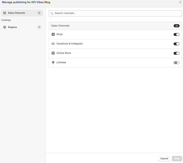 In the catalog of products, they list two options for the selling method of a product. One is “Link to Online Store,” and the other is “Sell Directly in Shop App.” The first option takes users to the link to buy the product. The second option lets users buy the product in the app.
